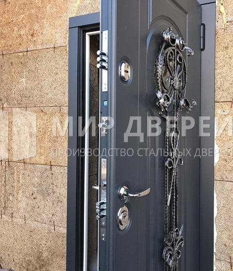 Дополнительный декор в виде ковки и фрезеровки выполняется по оригинальному рисунку или эскизу заказчика. Кованые элементы могут быть разных форм и размеров. Они украшают полотно и препятствуют повреждению стекла, зеркала или витража. Защитно-декоративные покрытия цвета меди или графита придают ковке привлекательный вид и предохраняют металл от коррозии. Разные варианты облицовки позволяют подобрать входную дверь для здания в любом стиле, от классического и модерна до лофта и хай-тека.